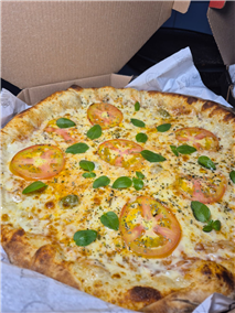 MOLHO DE TOMATE,MUSSARELA, TOMATE,MANJERICÃO, AZEITONA E ORÉGANO.